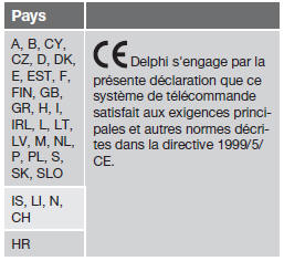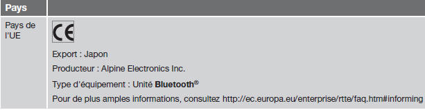 | France : | Par la présente alpine electronics, inc. Déclare que l'appareil bluetooth.. Module est conforme aux exigences essentielles et aux autres dispositions pertinentes de la directive 1999/5/ce. |