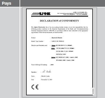 | Finlande : | Alpine electronics, inc. Vakuuttaa täten että bluetooth.. Module tyyppinen laite on direktiivin 1999/5/ey oleellisten vaatimusten ja sitä koskevien direktiivin muiden ehtojen mukainen. |