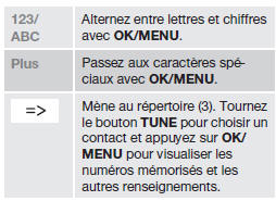 Si vous appuyez sur un bouton numéroté de la console centrale lorsque le cadran alphanumérique est affiché (voir illustration ci-dessus), une liste de caractères (1) apparaît. Maintenez le bouton numéroté enfoncé jusqu'à la lettre souhaitée et relâchez. Continuez avec la lettre suivante et ainsi de suite. Lorsque vous appuyez sur un bouton, la saisie est confirmée lorsque vous appuyez ensuite sur un autre bouton.