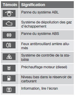 Si les témoins des freins et du système abs s'allument simultanément, cela signifie que le train arrière du èéhicule risque de déraper en cas de freinage brusque.